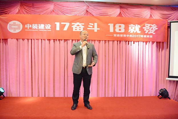 晚會伊始,中裝建設營銷管理中心總經理董網生以“17奮斗、18就發”為主題做營銷管理中心年度經營管理工作報告。董總指出,經過多年的市場拓展和總結,結合公司上市一年來的跨越,集團戰略版圖愈加清晰,市場資源整合效果顯著,經營管理工作高效務實。2018年,營銷管理中心將充分把握宏觀環境變化和市場發展態勢,以公司總體戰略規劃為藍圖,進一步優化整體業務結構和收益貢獻,與各區域運營中心一起初步實現公司百億企業目標。